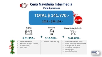 El menú económico, que incluye lechón, gaseosa, vino, ensalada de papa y huevo, más un postre compuesto por un kilo y medio de helado y una mesa dulce con pan dulce, budín sin frutas, garrapiñada, turrón de maní, ananá fizz y sidra, cuesta actualmente $87.127. Este menú refleja un aumento interanual del 140% en comparación con los valores del año pasado.