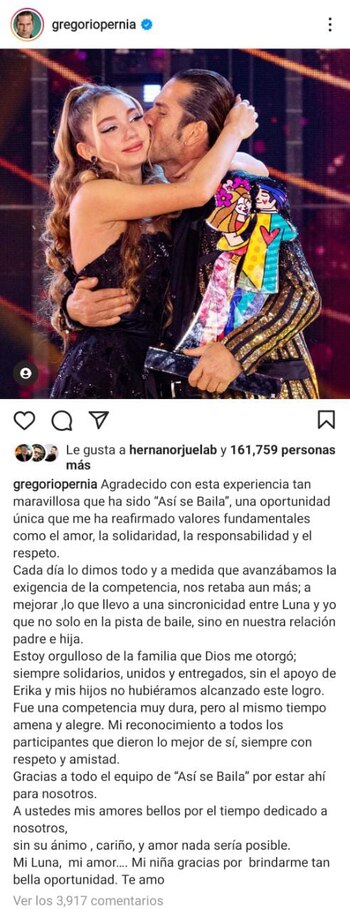 Pero Gregorio no fue el único que utilizó sus redes sociales para pronunciarse luego del programa, puesto que su hija hizo lo propio en su cuenta de Instagram y con su mensaje recordó parte de los desafíos que les significó a ambos el aceptar disputar un concurso de baile.