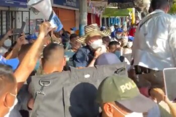 El expresidente se vio entregando más volantes a camioneros, conductores, comerciantes y después llegó con un sombrero vueltiao al Mercado para hacer un recorrido en el que empezó a recibir detractores hasta que le impidieron el paso.