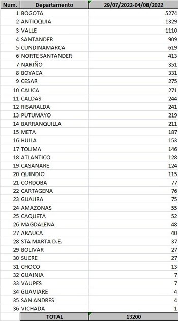 En cuanto a las regiones con más casos reportados, Bogotá lidera con 5.274 contagiados, seguido de Antioquia con 1.329 contagios y en tercer lugar Valle del Cauca con 1.110.