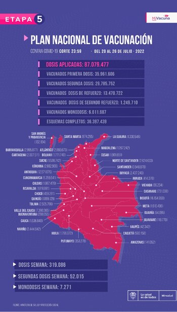 El más reciente reporte del Ministerio de Salud también señala que, con corte al periodo del 20 al 16 de julio de 2022, se han aplicado en Colombia un total de 87.079.477 dosis de la vacuna contra el covid-19.