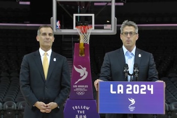 Mayor Garcetti and LA 2024 chairman Casey Wasserman then held a separate press conference on the free throw line of the Staples Center, home to the Los Angeles Lakers and Clippers of the National Basketball Association.