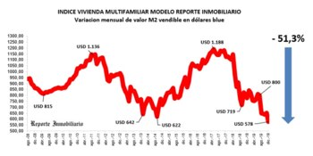 Con esta referencia, en los últimos siete meses el dólar subió 78%, frente a costos de la construcción que en ese lapso se incrementaron cerca del 30%. Esto redunda en una relación en términos reales que se desplomó 28% medidos en dólar “blue”, de USD 800 por metro cuadrado en julio de 2019 a USD 578 en diciembre pasado, según un informe de Reporte Inmobiliario.