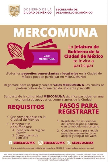 Para acceder a los vales Mercomuna, los solicitantes deben residir en la Ciudad de México, tener entre 19 y 56 años de edad, presentar identificación oficial vigente, comprobante de domicilio y CURP.