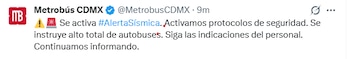 La Secretaría de Movilidad de la Ciudad de México informó que, tras la activación de la alerta sísmica, se realiza el protocolo de revisión en todos los sistemas de transporte de la Red de Movilidad Integrada.