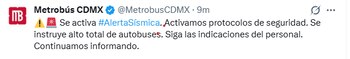 La Secretaría de Movilidad de la Ciudad de México informó que, tras la activación de la alerta sísmica, se realiza el protocolo de revisión en todos los sistemas de transporte de la Red de Movilidad Integrada.
