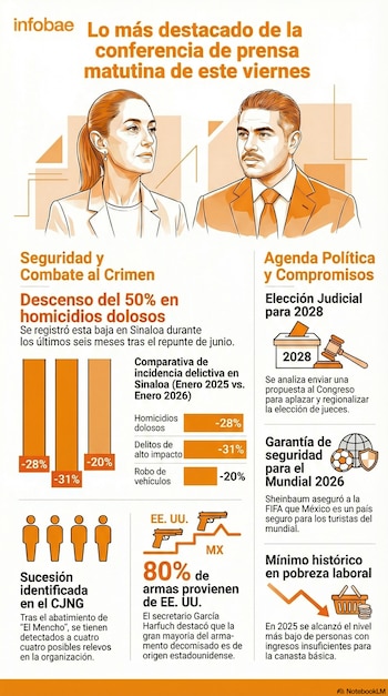 Seguridad y el Mundial de 2026: Compartió que el presidente de la FIFA le preguntó directamente sobre el panorama de seguridad en México. La mandataria le transmitió tranquilidad, explicándole que los recientes brotes de violencia fueron episodios focalizados, derivados exclusivamente de las reacciones ocurridas el pasado domingo tras el asesinato de “El Mencho”.