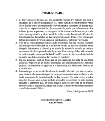 En un comunicado difundido en redes sociales, San Martín precisó que lo que manifestó en relación a los representantes del Ministerio Público fue “parte de la sesión absolutamente privada entre los magistrados y el personal de la Secretaría Técnica del Centro de Investigaciones Judiciales”. En dicho espacio se dan cuenta de los temas propuesto por juristas e instituciones públicas y privadas.