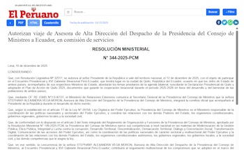 La abogada Stephany Vega, asesora de Alta Dirección del Despacho de la Presidencia del Consejo de Ministros (PCM), formará parte de la comitiva oficial que acompañará al presidente interino José Jerí a Ecuador, según una resolución publicada este jueves en el diario oficial El Peruano.