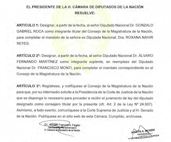 El presidente de la Cámara de Diputados, Martín Menem, designó al cordobés Gonzalo Roca (La Libertad Avanza) como miembro titular del Consejo de la Magistratura de la Nación, en reemplazo de una legisladora radical que venció su mandato.