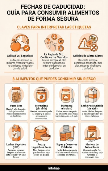 La “fecha de consumo preferente” (“use by” o “best before”) orienta sobre cuándo el alimento mantiene su máxima calidad, pero no siempre significa que deba ser descartado al día siguiente. Mayo Clinic remarca que, ante la duda, el consumidor debe examinar el alimento y confiar en los sentidos antes de tirar productos solo por la fecha.