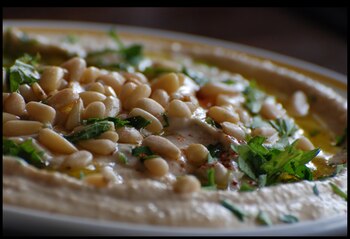 Hervir los piñones por aproximadamente 3 horas hasta que estén tiernos. Colarlos y colocarlos en una procesadora o licuadora junto con el aceite, sal, ajo, jugo de limón, pimienta, y cibuoulette. Procesarlos hasta obtener una consistencia cremosa.